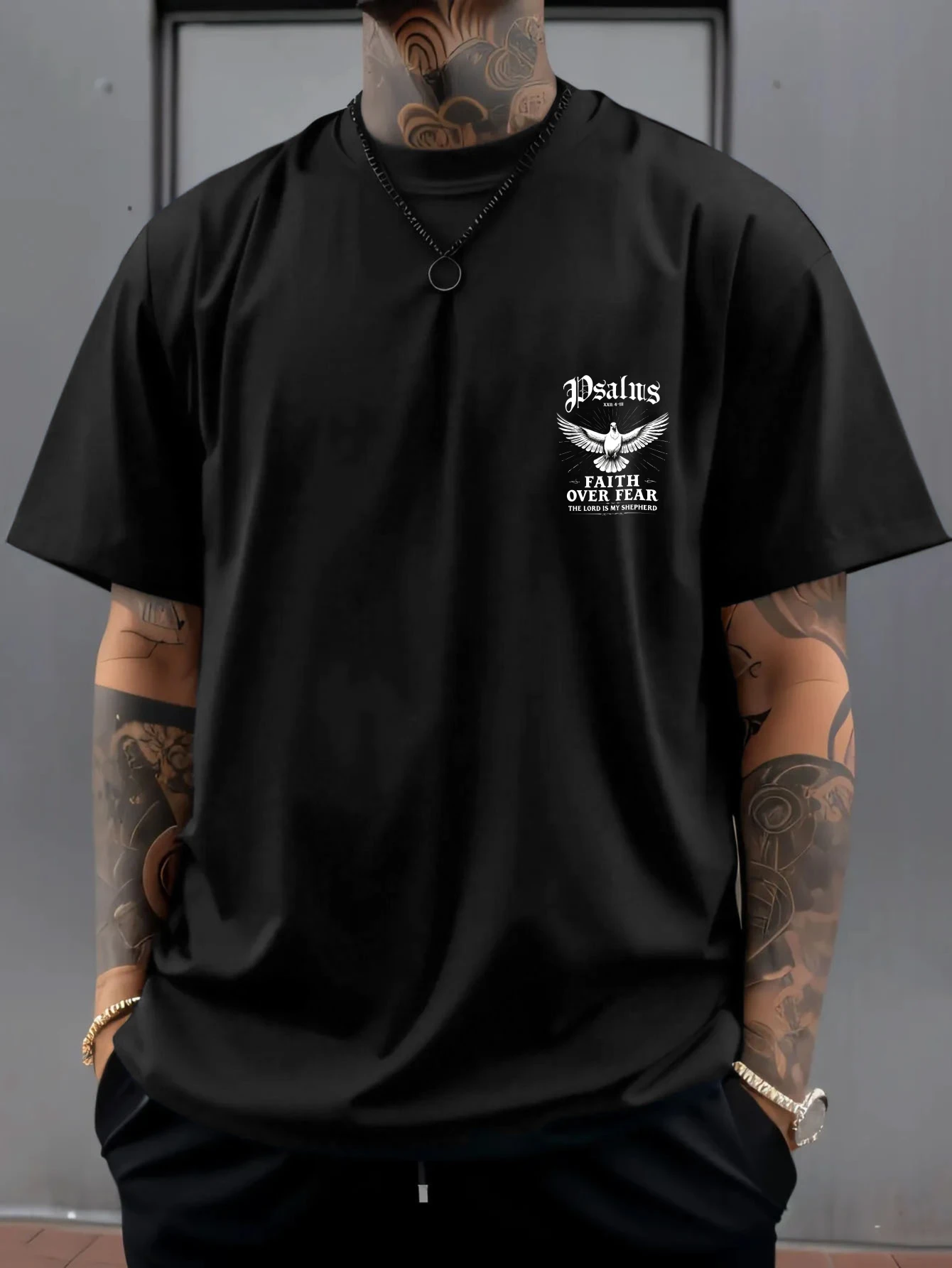 Men's Black T-Shirt Faith Over Fear Dove Psalm 23 Printed High Quality Cotton 180g+ Religious Christian Statement Tee for Church