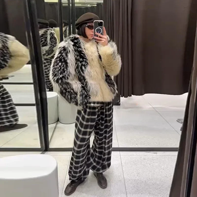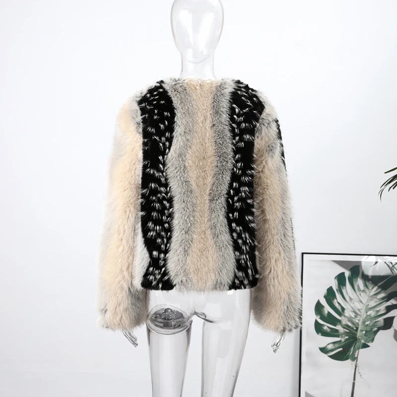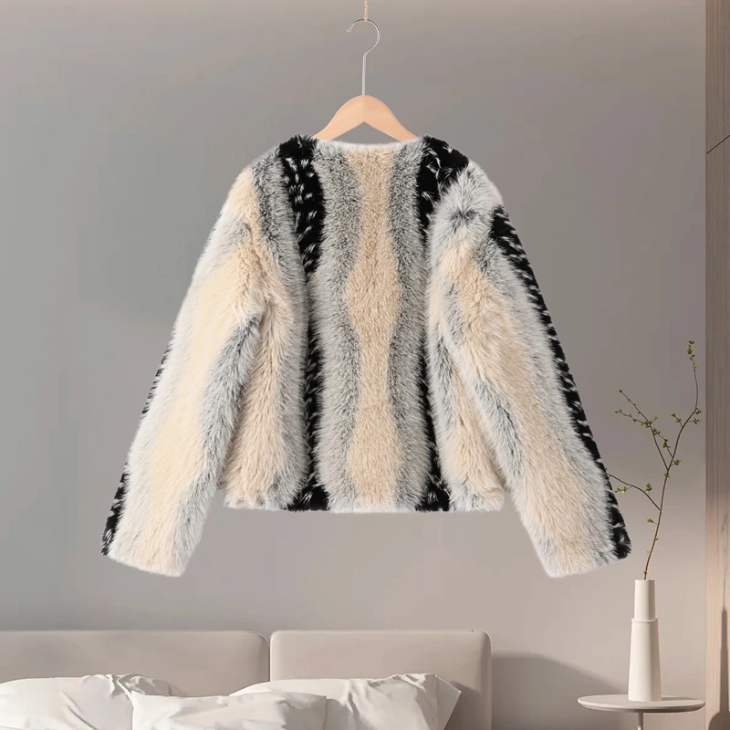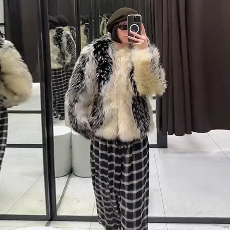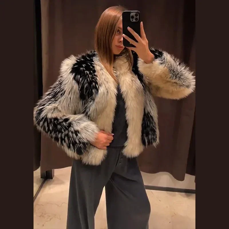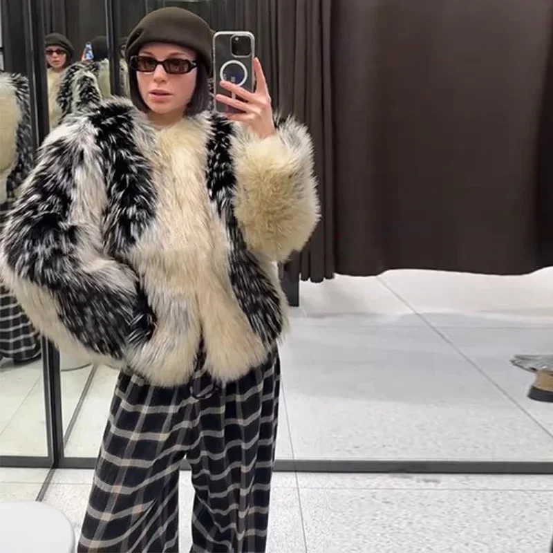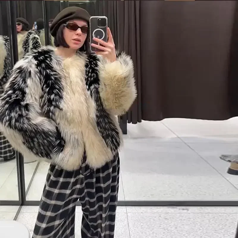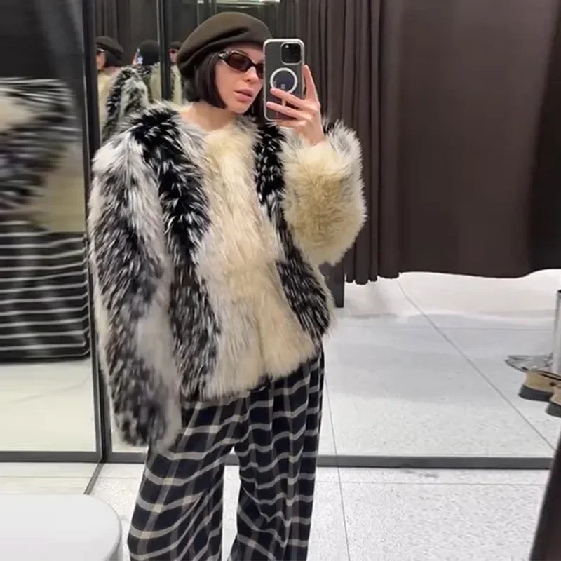Stylish Contrast Faux Fur Women Coat Elegant O-neck Single Breasted Full Sleeve Female Coats 2026 Spring Winter Chic Lady Jacket