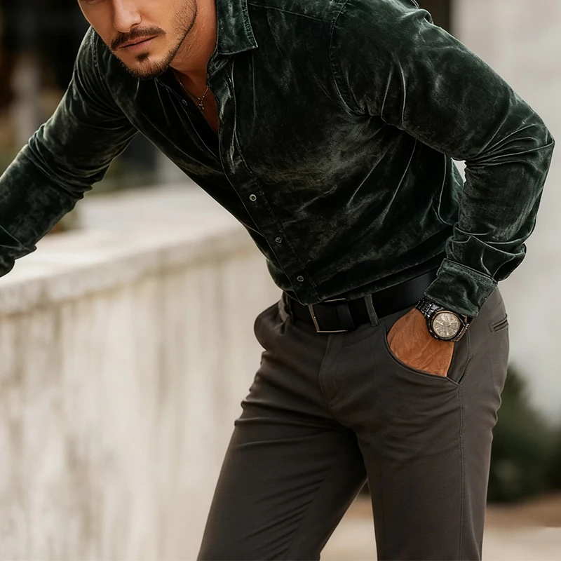 Stylish Solid Color Velvet Shirts Mens Long Sleeve Button-up Turn-down Collar Casual Shirt Fall Winter Daily Leisure Men Shirts
